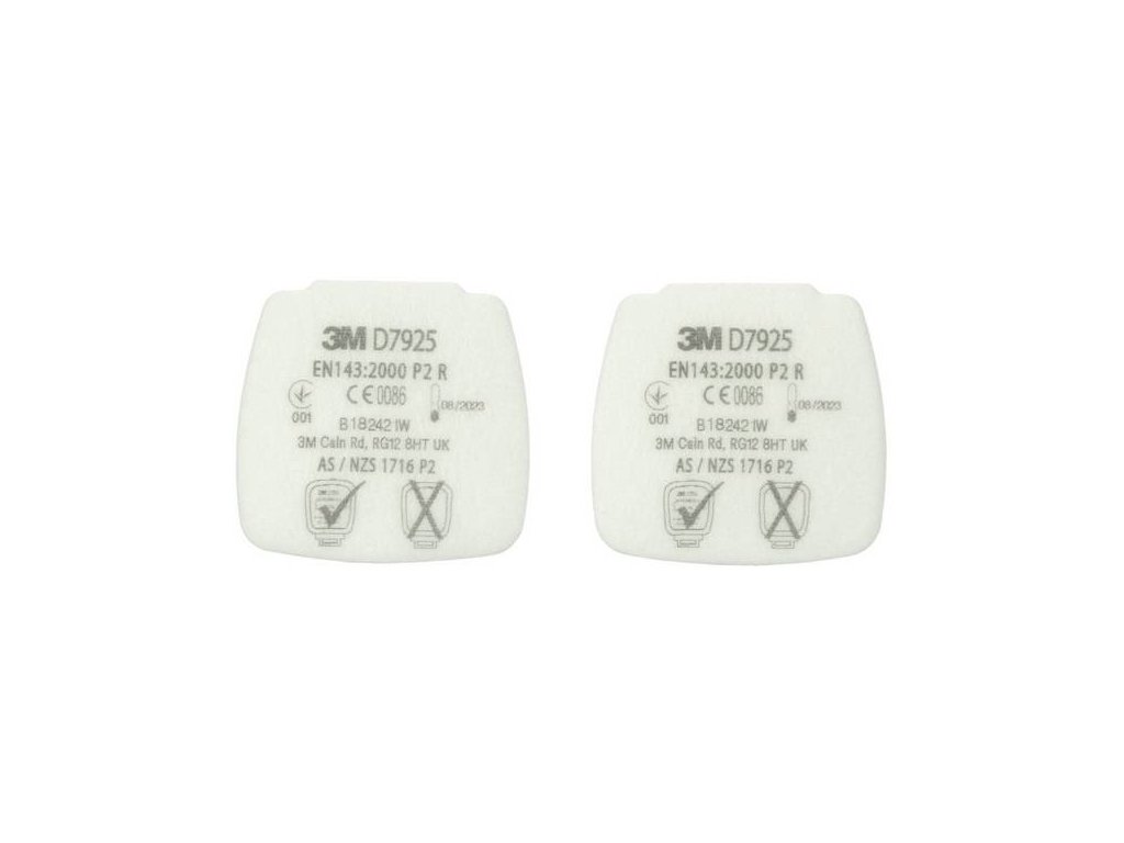 - 3M™ Secure Click™ - částicový filtr P2 R D7925 má CE schválení pro prostředí obsahující pevné a kapalné částice. Používejte s maskami 3M™ Secure Click™ série 800 a 3M™ Secure Click™ filtry série D8000 Series a držákem filtrů 3M™ D701.