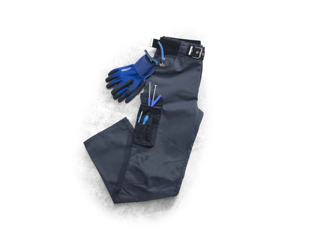Kvalitní směsový materiál polyesteru s příměsí bavlny s vysokou gramáží látky zajišťuje vysokou odolnost proti mechanickému poškození při práci. Zároveň je materiál v partiích kolen, které snáze podléhají ošoupání a oděru, zdvojený, a pracovník se tak nemusí stresovat poškozením kalhot při práci vkleče. Navíc oblast kolen s anatomicky tvarovanými záševky disponují možností vkládání nákoleníků do našitých kapes pro ještě vyšší ochranu.