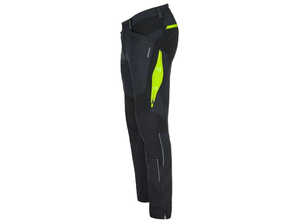 Montérkové kalhoty do pasu se strečovými vsadkami jsou navrženy pro maximální komfort a dlouhou životnost. Kombinace moderních materiálů zajišťuje vynikající pevnost, pružnost a odolnost i v náročných podmínkách. Kalhoty jsou vyrobeny ze speciální tkaniny se zesílenými panely Cordura® pro maximální ochranu namáhaných částí proti oděru. Anatomický 3D Silhouette COMFORT FIT střih umožňuje volnost pohybu, ergonomicky navržené linie zajišťují pohodlné nošení a boční ventilační zipy se síťovinou pomáhají s odvodem tepla. Elastický pas poskytuje pohodlné přizpůsobení obvodu pasu. Kalhoty jsou vybaveny rivety pro vyšší životnost a kovovým D-kroužkem pro uchycení předmětů. Prakticky řešené kapsy zahrnují 2 hluboké průhmatové kapsy, 2 zipové kapsy na mobil a drobnosti a dvě multifunkční zipové kapsy na zadní straně kalhot. Pro zvýšení bezpečnosti jsou kalhoty opatřeny dynamickými reflexními prvky, které zajišťují lepší viditelnost při práci ve zhoršených světelných podmínkách. Spodní lem nohavic je doplněn o zipy, které umožňují rozšíření obvodu nohavic pro snadné přetažení kalhot přes širší obuv a jsou opatřeny skrytými kovovými háčky, aby kalhoty perfektně držely na svém místě. Kalhoty jsou kompatibilní s přídavnými vyztuženými nářaďovými kapsami, které jsou určeny k nasazení na opasek pomocí suchých zipů. Sadu přídavných nářaďových kapes, která doplňuje kolekci, je možné objednat samostatně pod objednávkovým číslem H6260.