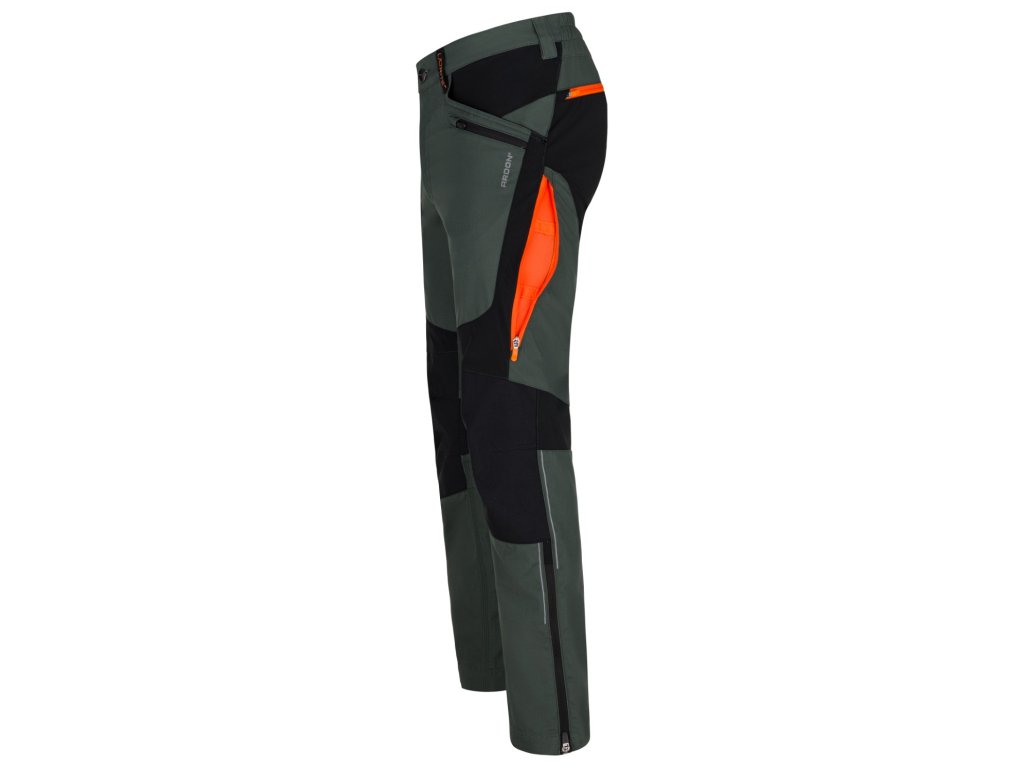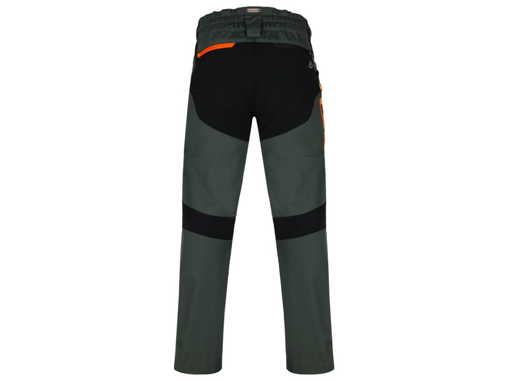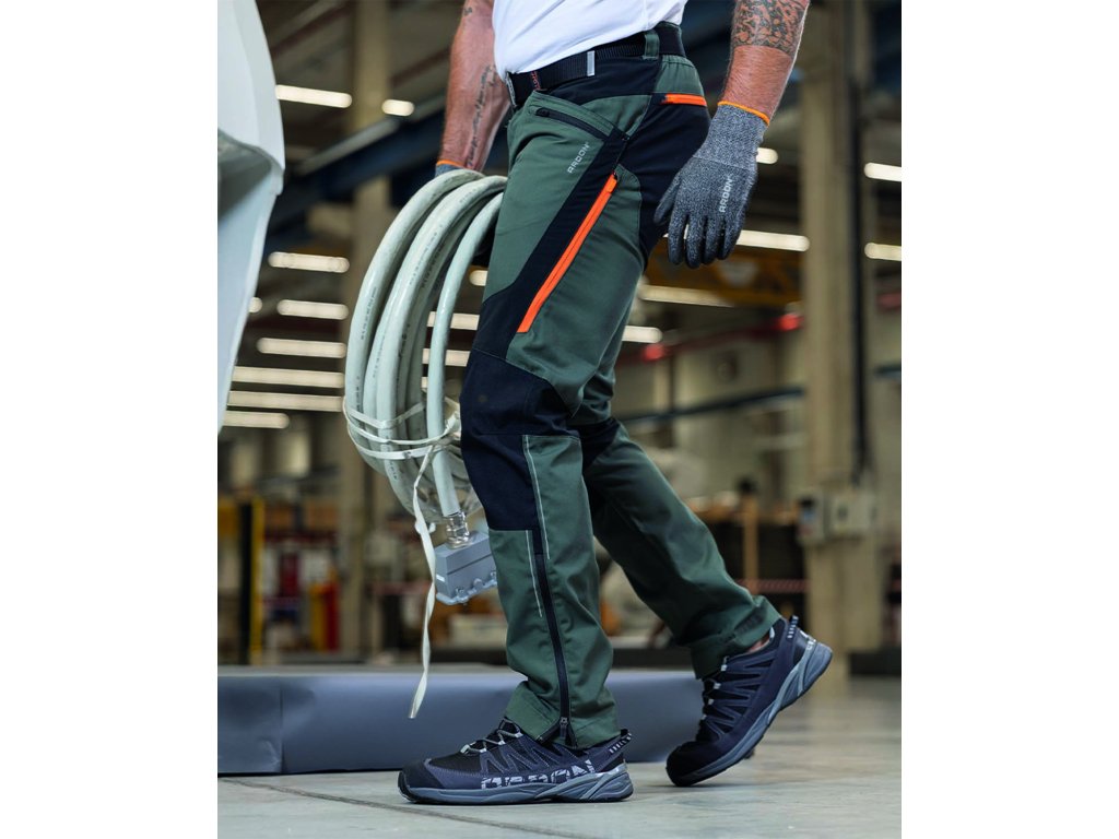 Montérkové kalhoty do pasu se strečovými vsadkami jsou navrženy pro maximální komfort a dlouhou životnost. Kombinace moderních materiálů zajišťuje vynikající pevnost, pružnost a odolnost i v náročných podmínkách. Kalhoty jsou vyrobeny ze speciální tkaniny se zesílenými panely Cordura® pro maximální ochranu namáhaných částí proti oděru. Anatomický 3D Silhouette COMFORT FIT střih umožňuje volnost pohybu, ergonomicky navržené linie zajišťují pohodlné nošení a boční ventilační zipy se síťovinou pomáhají s odvodem tepla. Elastický pas poskytuje pohodlné přizpůsobení obvodu pasu. Kalhoty jsou vybaveny rivety pro vyšší životnost a kovovým D-kroužkem pro uchycení předmětů. Prakticky řešené kapsy zahrnují 2 hluboké průhmatové kapsy, 2 zipové kapsy na mobil a drobnosti a dvě multifunkční zipové kapsy na zadní straně kalhot. Pro zvýšení bezpečnosti jsou kalhoty opatřeny dynamickými reflexními prvky, které zajišťují lepší viditelnost při práci ve zhoršených světelných podmínkách. Spodní lem nohavic je doplněn o zipy, které umožňují rozšíření obvodu nohavic pro snadné přetažení kalhot přes širší obuv a jsou opatřeny skrytými kovovými háčky, aby kalhoty perfektně držely na svém místě. Kalhoty jsou kompatibilní s přídavnými vyztuženými nářaďovými kapsami, které jsou určeny k nasazení na opasek pomocí suchých zipů. Sadu přídavných nářaďových kapes, která doplňuje kolekci, je možné objednat samostatně pod objednávkovým číslem H6260.