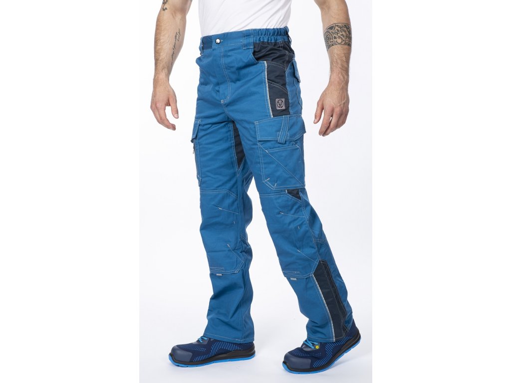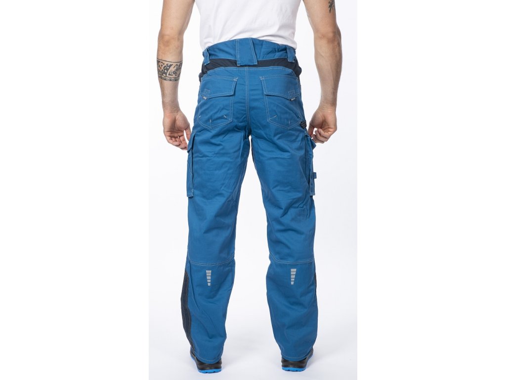 Výrobce neopomněl ani bezpečnost pracovníka, a proto jsou kalhoty prošívané kontrastní riflovou nití a doplněny originálními stříbrnými reflexními potisky.