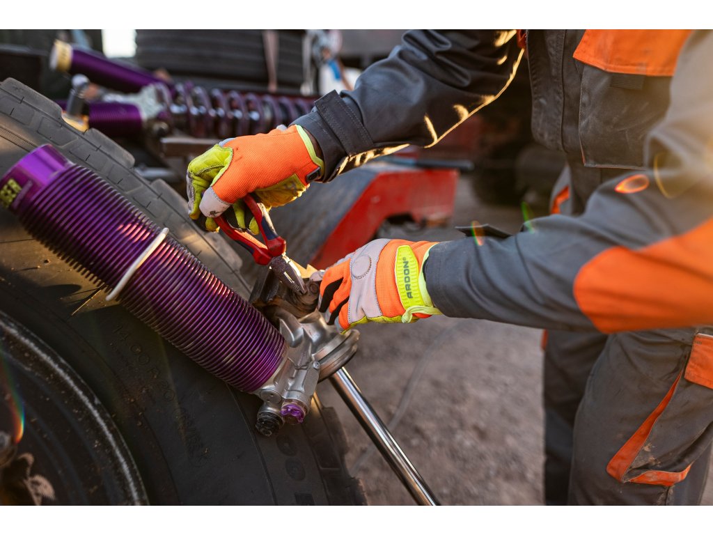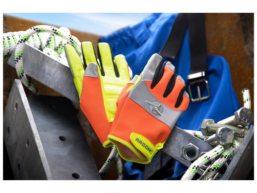 Pracovní rukavice mají pevnou dlaň z kozinky ve výrazné žluté reflexní barvě. Perfektně tak chrání dlaň, ale zároveň poskytují dostatečnou citlivost při úchopu. Hřbet ochranných rukavic je ze spandexu v zářivé oranžové barvě.
