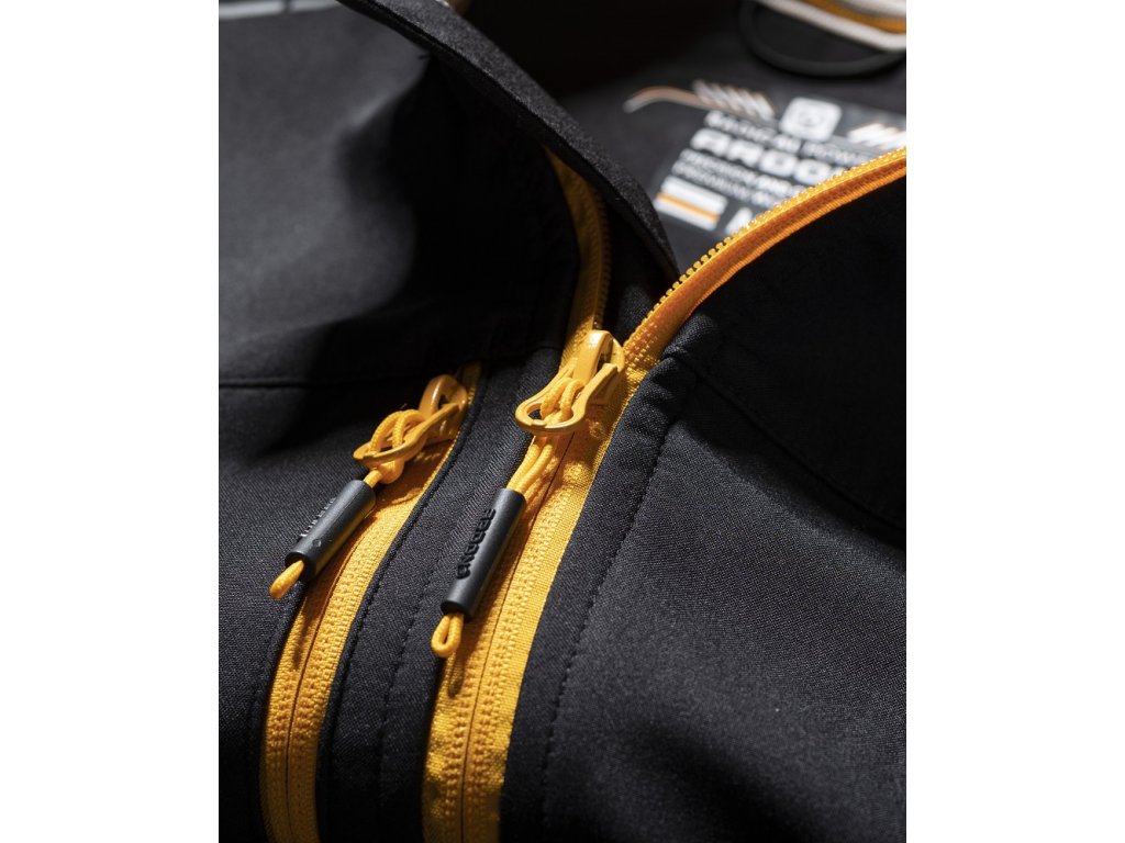 Černou plochu bundy zdobí kontrastní lemy a decentní potisk.
