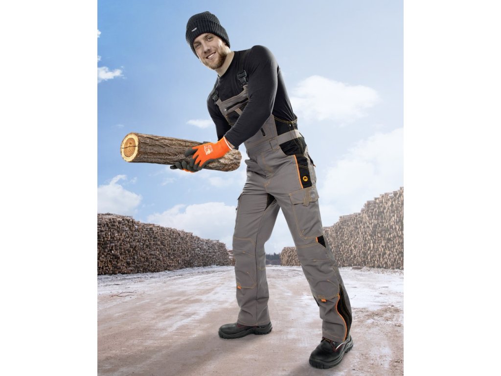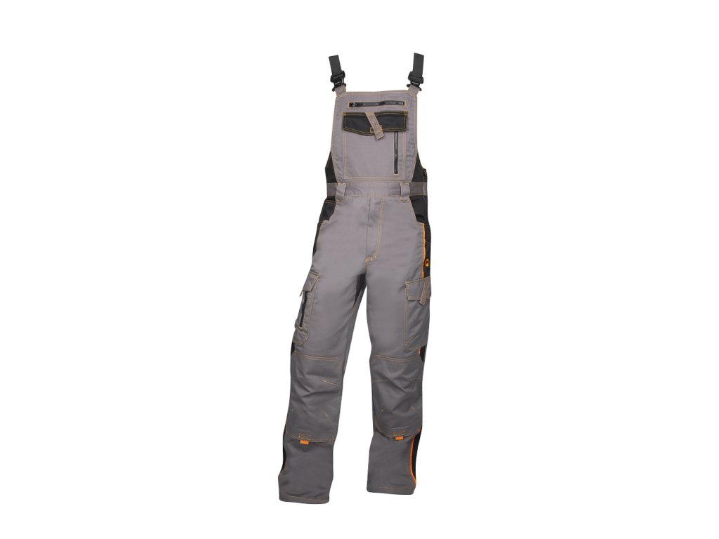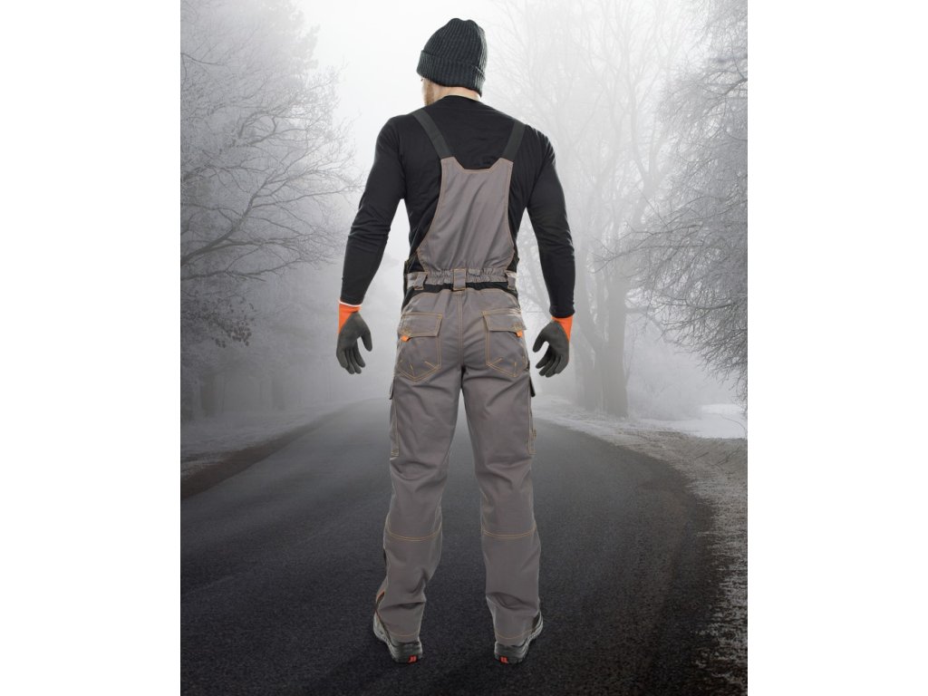 Vrstvené jsou též kapsy na nářadí na boční straně stehen a na laclu kalhot. Dvě našívané kapsy s patkou pracovník najde na zadním díle, k dispozici mu je též velká uzavíratelná náprsní kapsa.